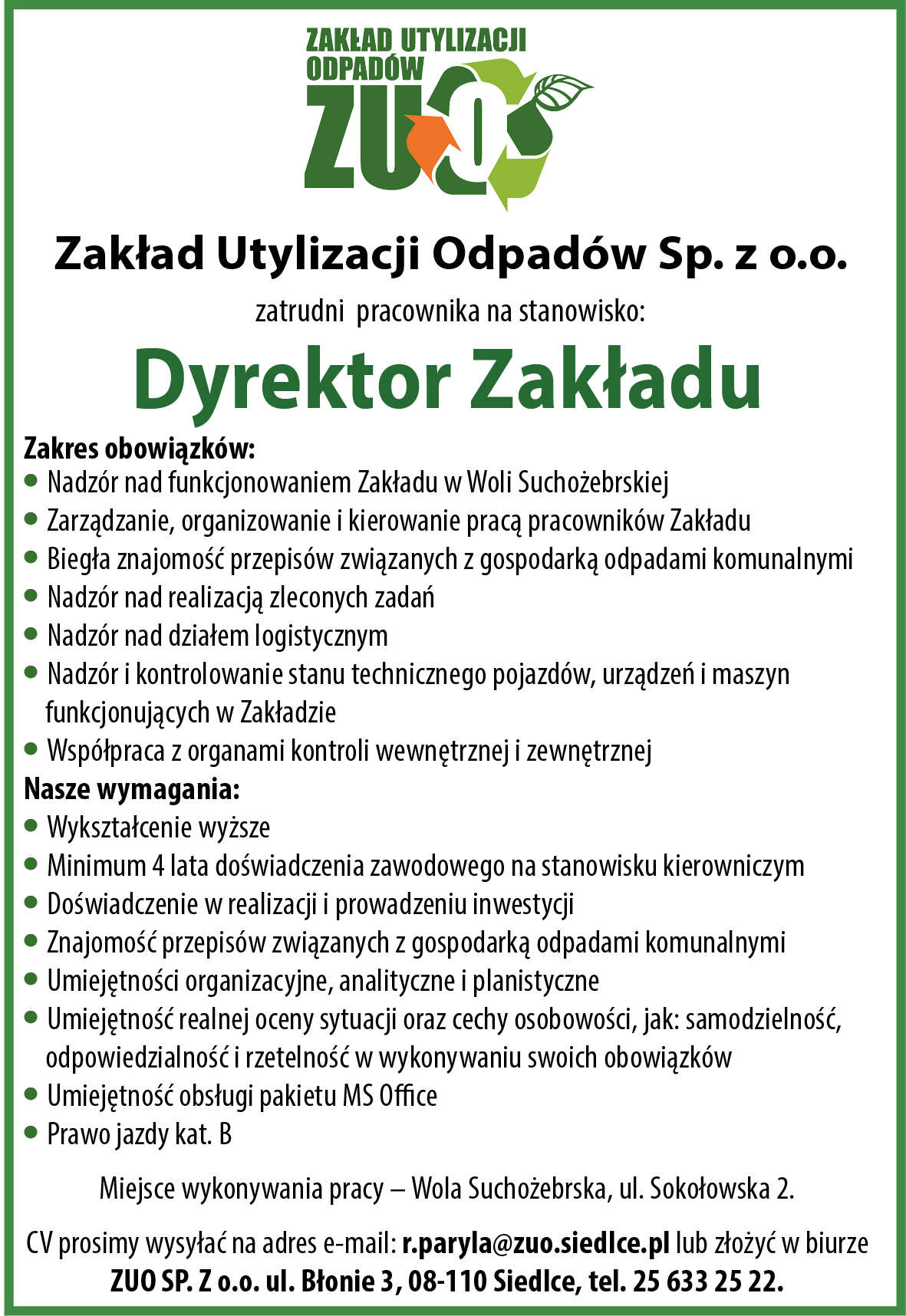 Zakład Utylizacji Odpadów sp. z o.o. prowadzi nabór na stanowisko Dyrektora Zakładu w Woli Suchożebrskiej. Poniżej przedstawiony jest opis stanowiska oraz wymagania, które musi spełniać kandydat. CV można przesyłać na adres r.paryla@zuo.siedlce.pl lub złozyć osobiście w biurze ZUO sp. z o.o. przy ul. Błonie 3 w Siedlcach.